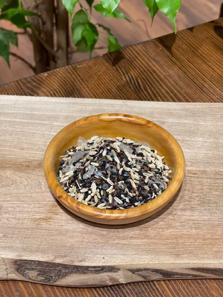 Mavi gözyaşı, Şap, Yaprak Buhur, Akgünlük Reçinesi, Lavanta, Çörekotu, Rezene, Arpa, Üzerlik Tohumu, Anason, Adaçayı, Karabiber gibi yenilebilir doğallıktaki ürünlerden 7 tanesi seçilip kızgın bir tavada tütsü haline getirilerek kullanılır.